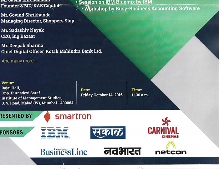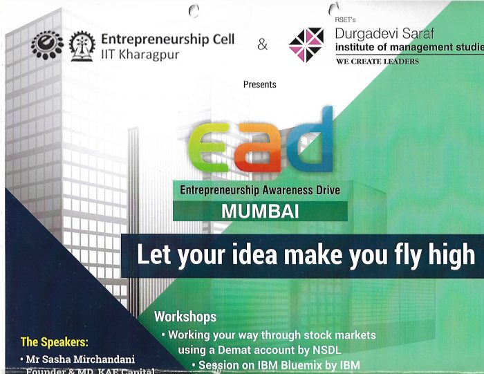 In 2016, DSIMS E cell as per the MOU signed with IIT Kharagpur, organized “Entrepreneurship Awareness Drive” (EAD) on 14th October 2016 at Bajaj Hall. Distinguished speakers addressed 300 plus delegates. DSIMS students alongwith students from other institutes attended the workshop.